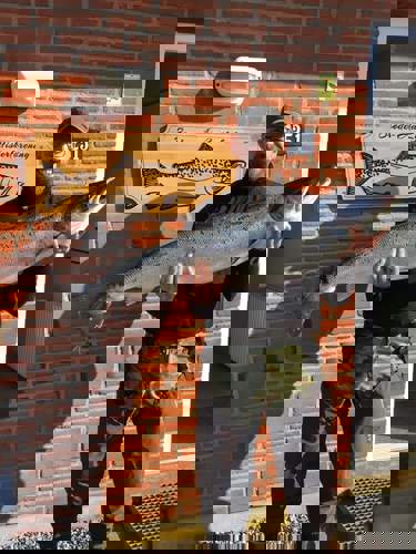 Øl, pølser og godt humør blev nydt i strålende solskin, og på galgen hang ved middagstid 2 store sølvblanke laks og skinnede om kap med solen.